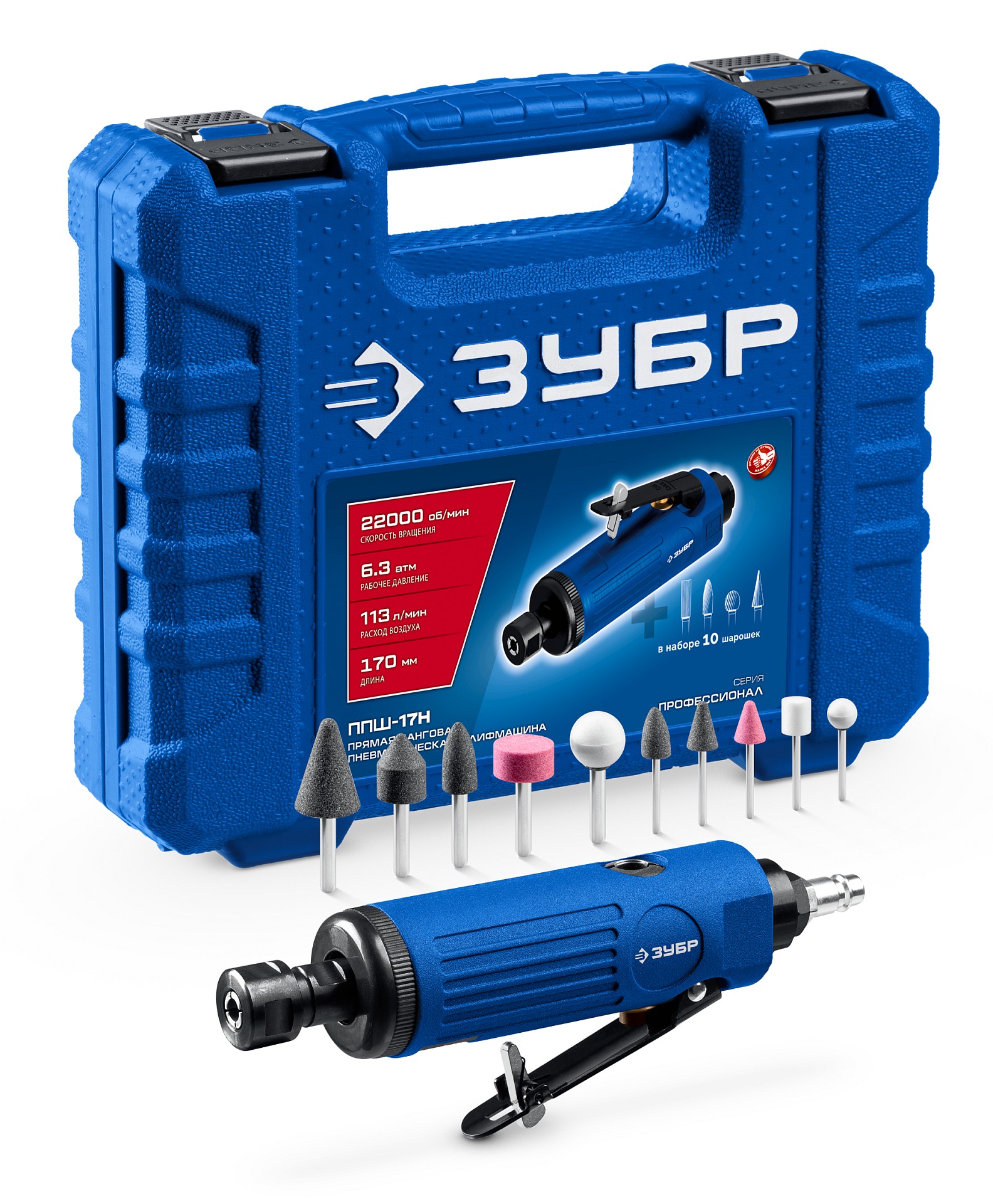 ЗУБР набор в кейсе: прямая цанговая пневмошлифмашина, 10 шарошек и оснастка, ПРОФЕССИОНАЛ (64333-H)