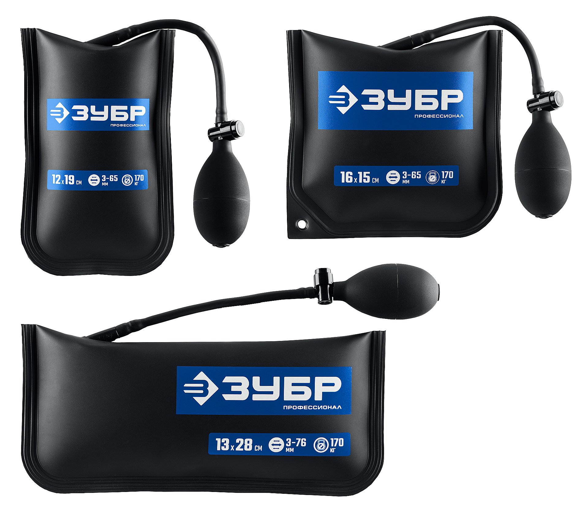 ЗУБР ПНЕВМОПОДУШКА набор 3шт: 12х19, 16х15, 13х28 см, 170кг, в чехле, универсальный пневмоклин/ монтажная подушка/ пневмодомкрат (37556-H3)