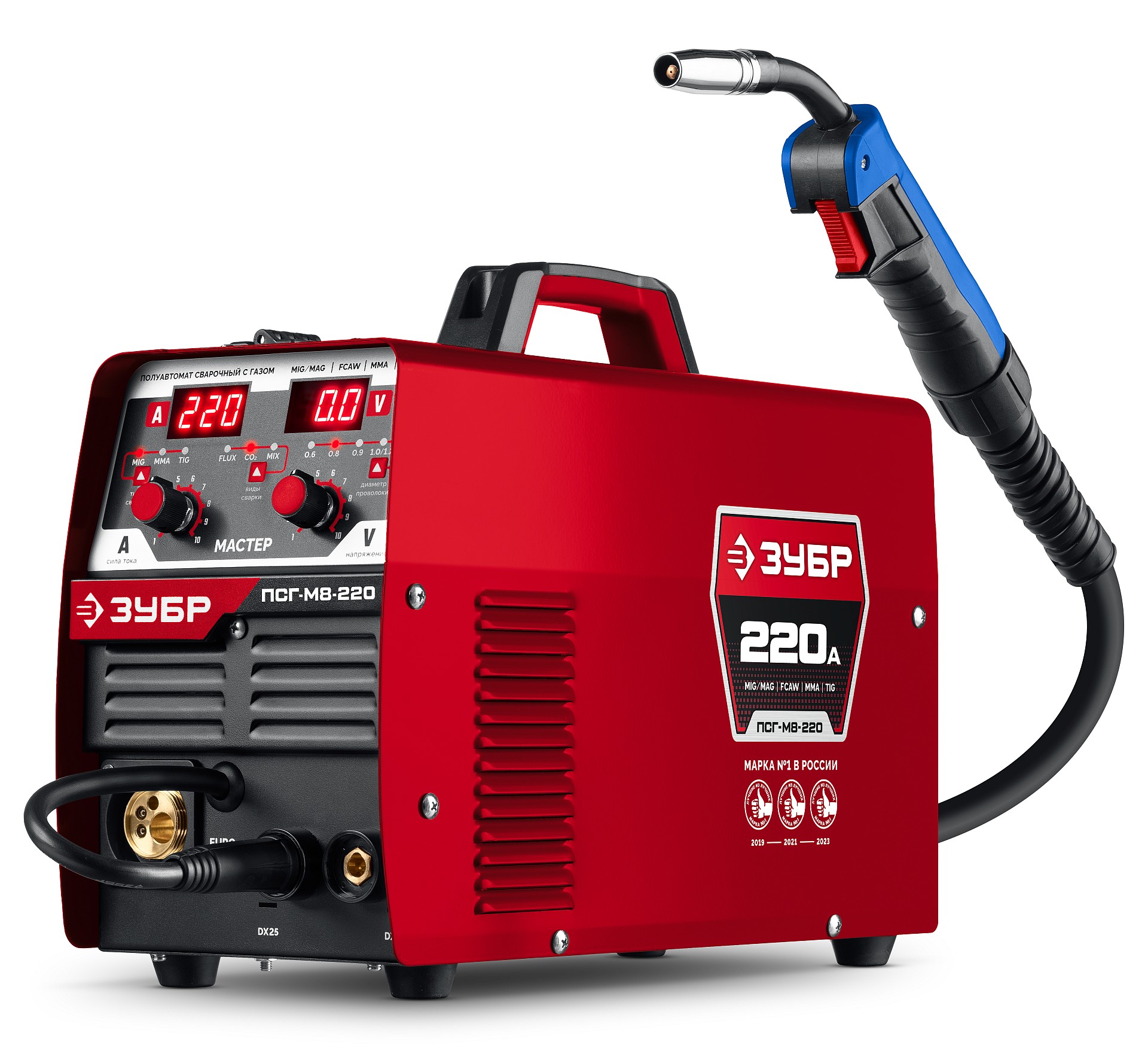 ЗУБР MASTER, MIG / MAG, FCAW, MMA, TIG, 220 А, полуавтомат сварочный, с газом / без газа, горелка ПСГ-220 (ПСГ-М8-220)