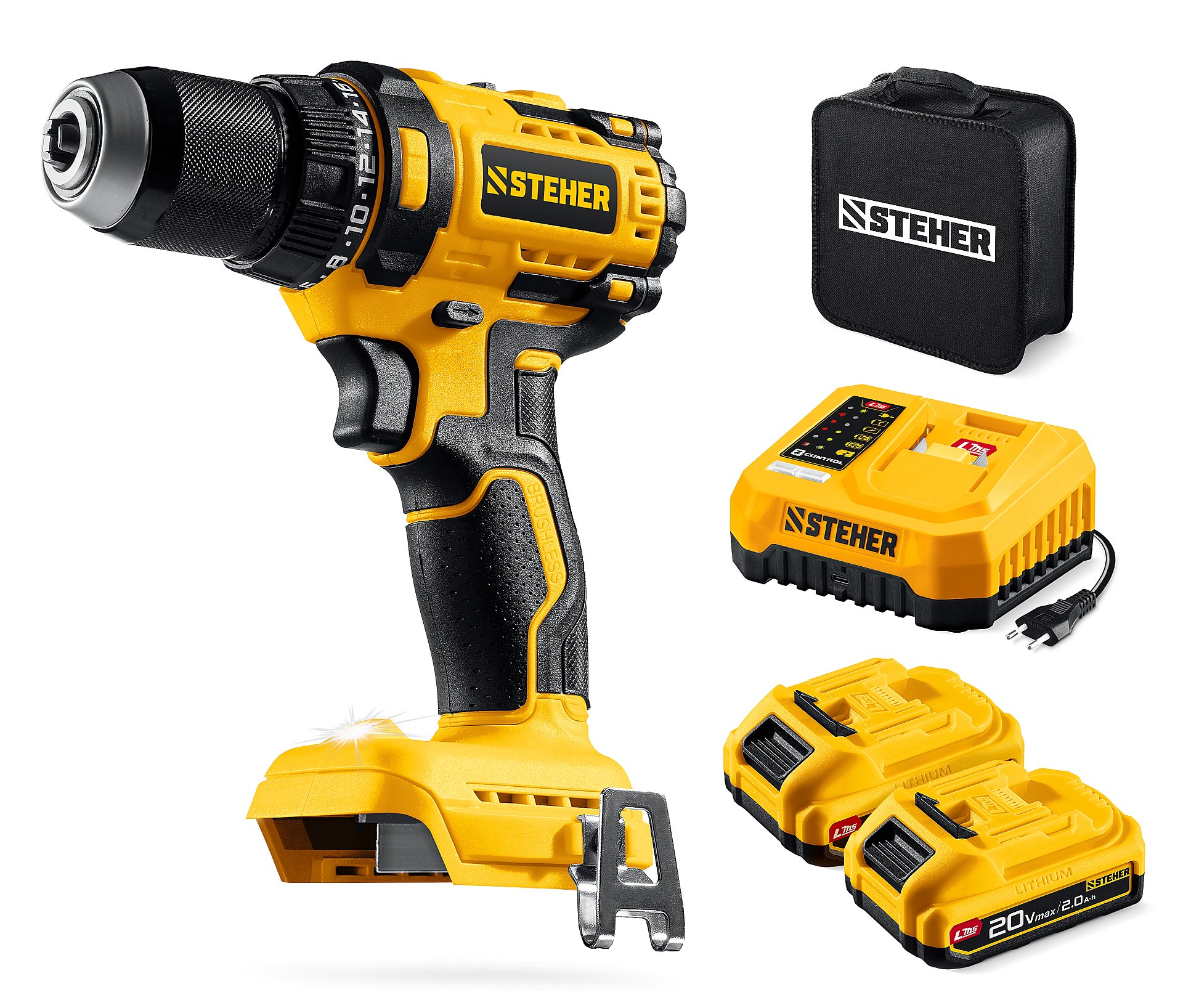 STEHER 20 В, 65 Н·м, 2 АКБ LMS (2 А·ч), бесщеточная дрель-шуруповерт, сумка (CB-65-22)