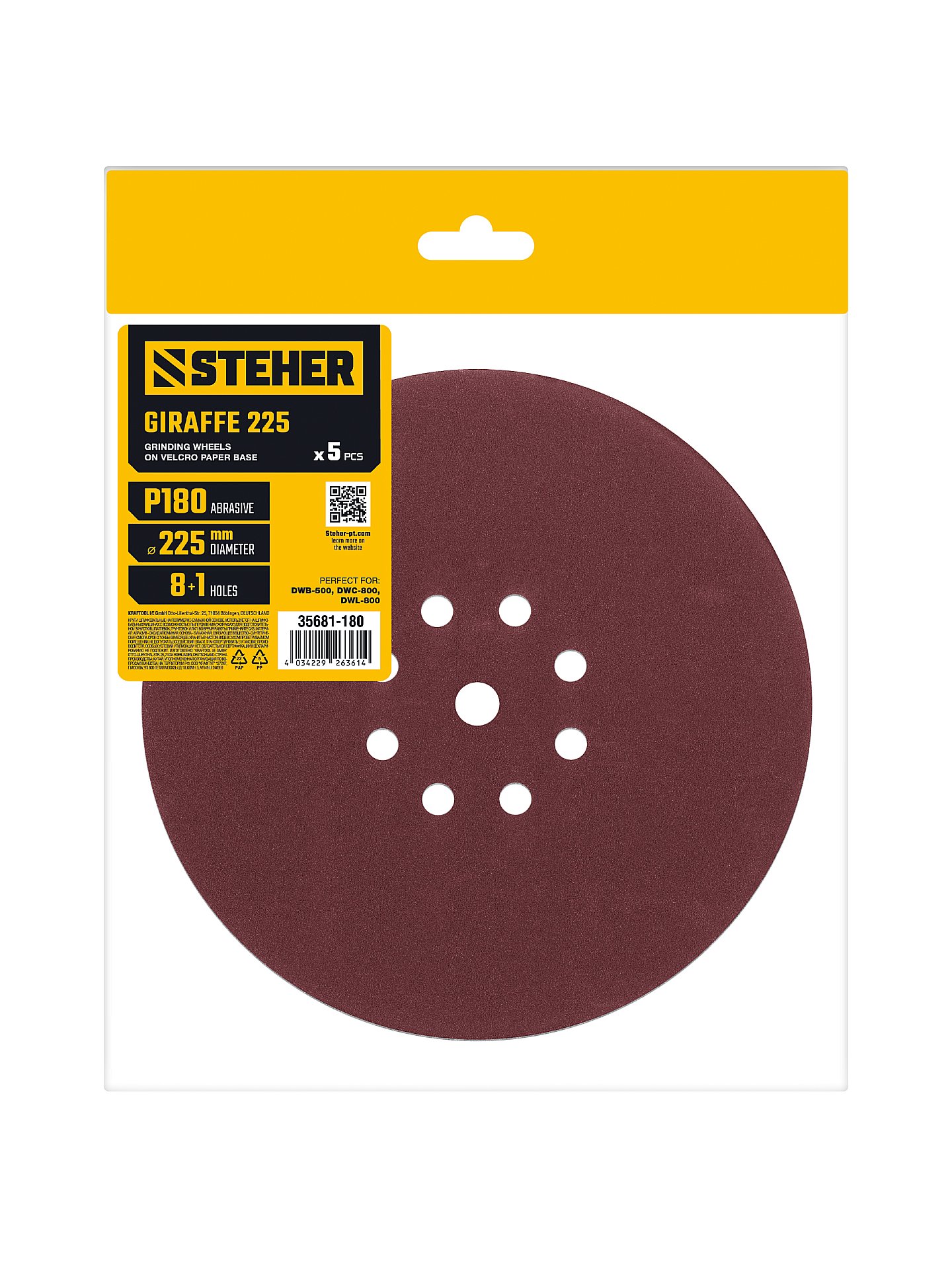 STEHER GIRAFFE 225 мм, Р180, шлифовальный круг на липучке, 9 отв., 5 шт. (35681-180)